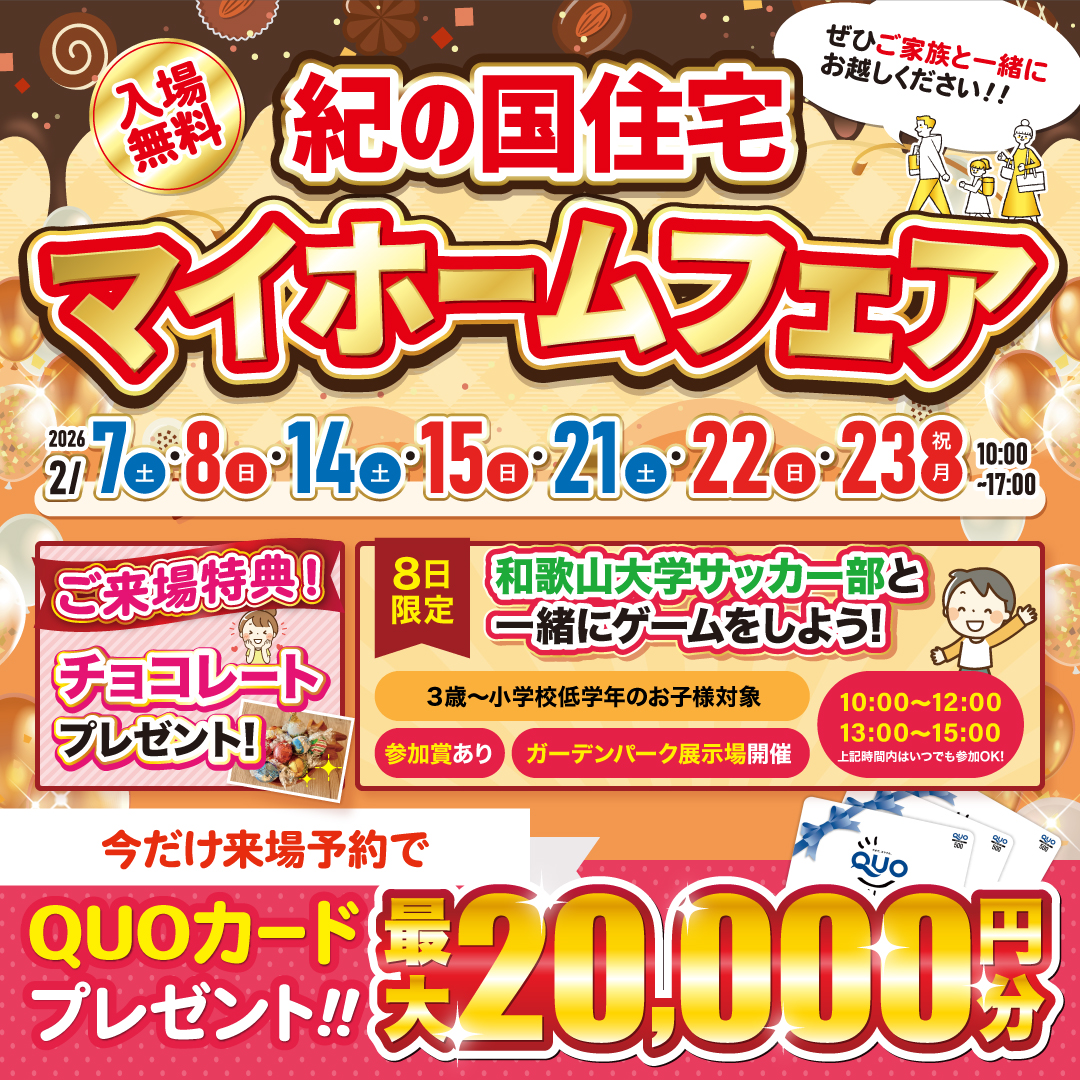 2026.01.31 【インター展示場、ガーデンパーク展示場、小雑賀展示場、岩出・紀の川展示場、貝塚展示場 5店舗同時開催】2/7(土)・8(日)・14(土)・15(日)・21(土)・22(日)・23(月)マイホームフェア☆