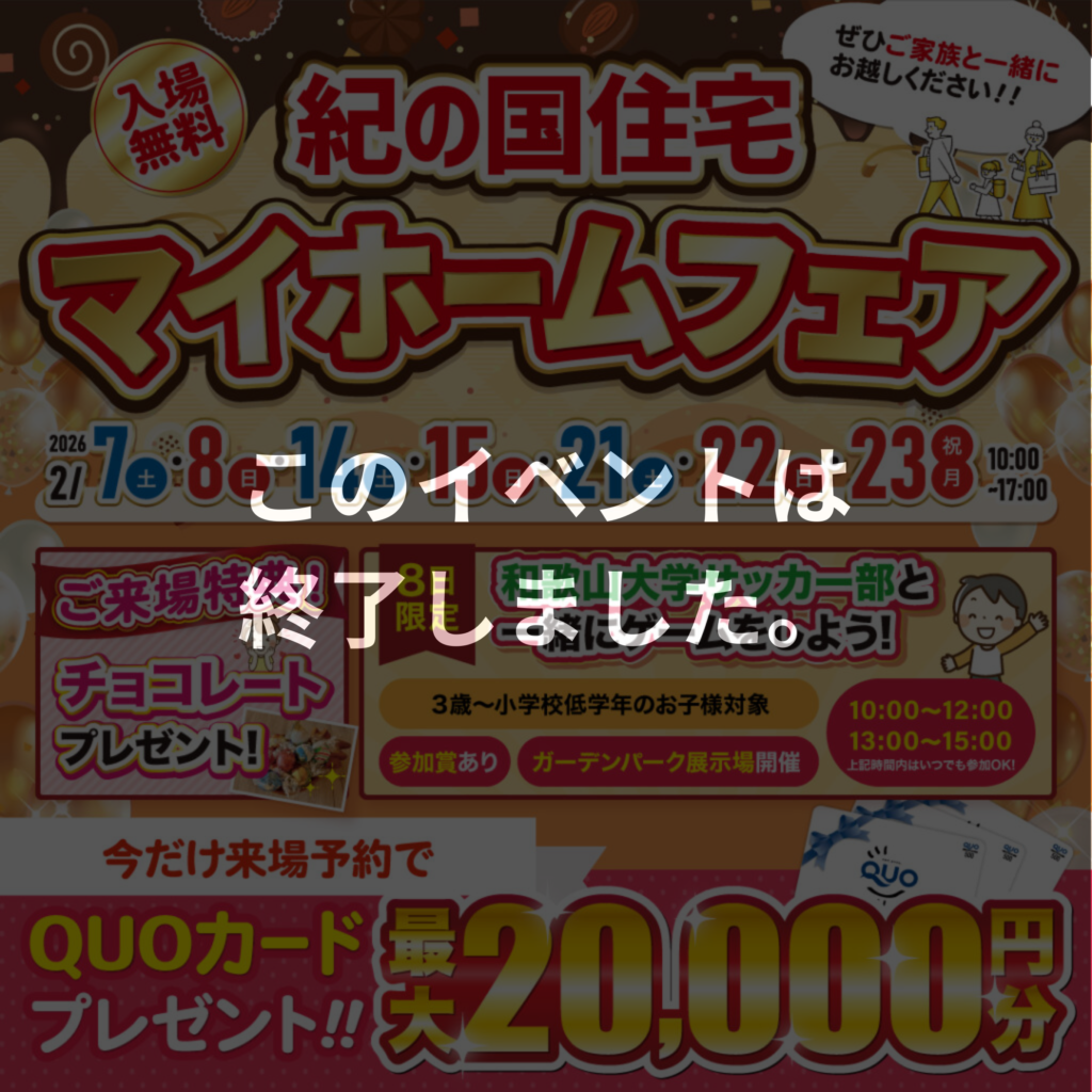 【インター展示場、ガーデンパーク展示場、小雑賀展示場、岩出・紀の川展示場、貝塚展示場 5店舗同時開催】2/7(土)・8(日)・14(土)・15(日)・21(土)・22(日)・23(月)マイホームフェア☆